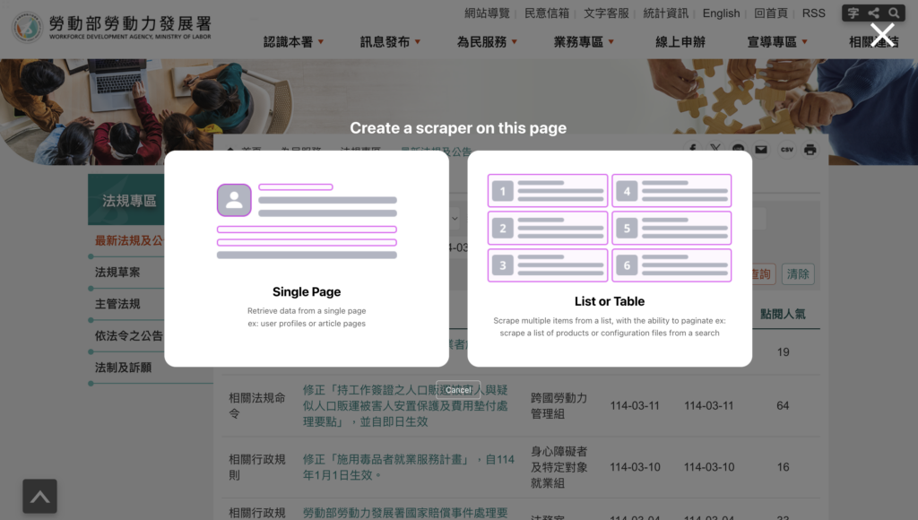 以勞動部最新法規及公告網站為例,在 Growise 輸入網址 https://www.wda.gov.tw/News.aspx?n=67&sms=10333,就會自動啟動 Growise 瀏覽器插件,並且詢問使用者要擷取單頁文字(Single Page)還是清單表格(List or Table),這邊我們選擇清單表格。